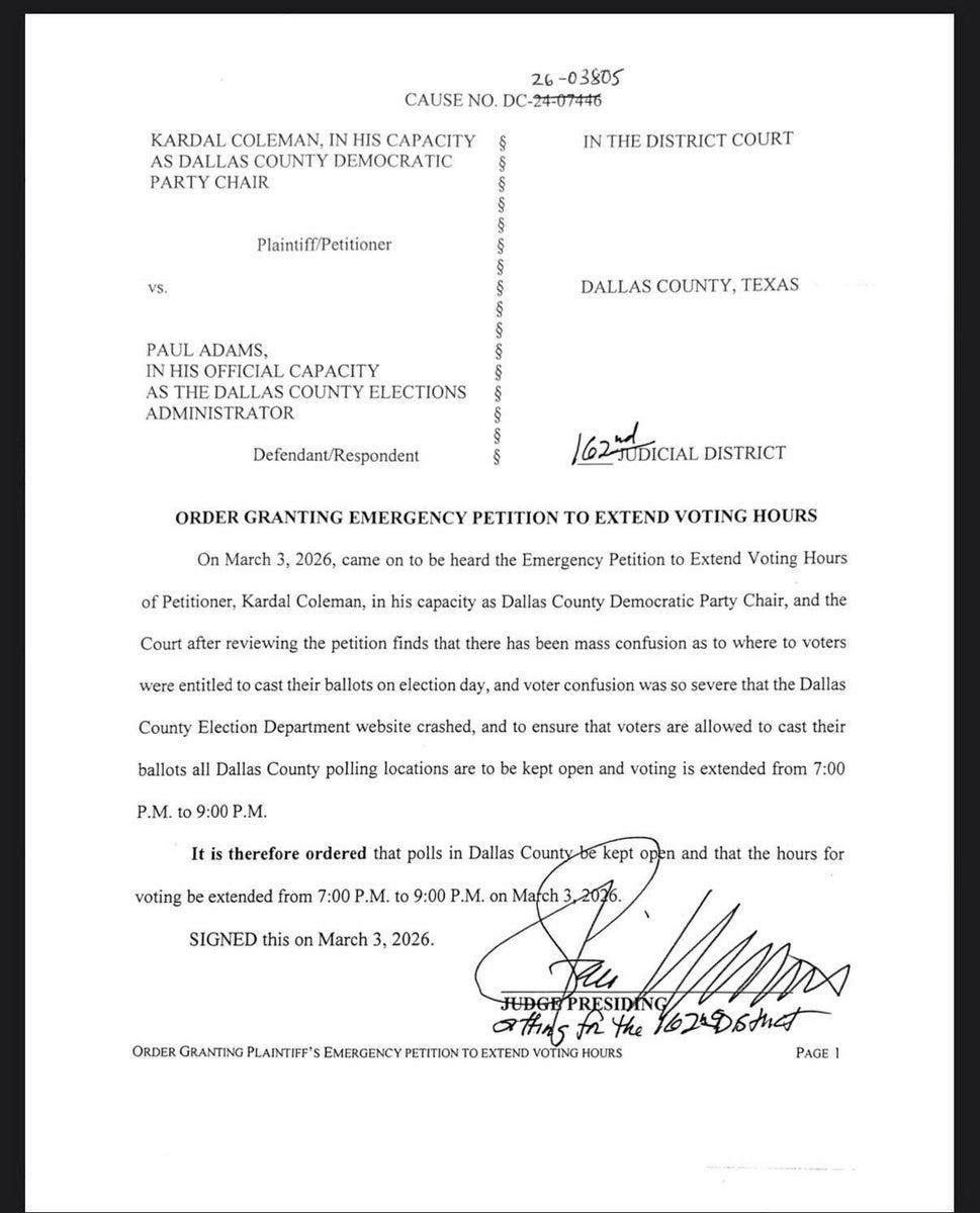Dallas County Democratic Party Chair Kardal Coleman filed an emergency petition. A district court judge ordered the polls to stay open until 9pm so voters who’d been sent to the wrong locations—through no fault of their own—could still cast their ballots. Dallas County Judge Clay Jenkins confirmed the extension.