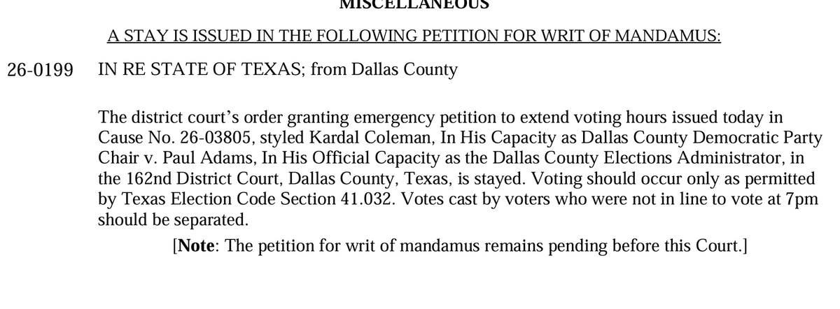 And the Texas Supreme Court—which, let’s be clear, is an all-Republican court—issued a temporary stay. They blocked the extension and ordered Dallas County to separate out all votes cast by people who weren’t in line by 7pm.